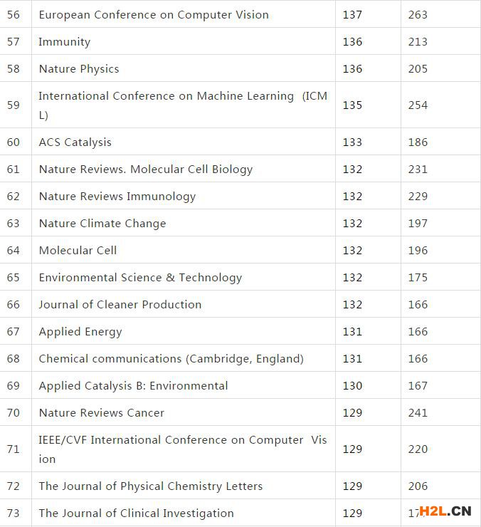Google學術計量中,讀者可以瀏覽100中期刊和會議等出版物的信息,其排序和分類指標是依據(jù)五年h指數(shù)和h中位數(shù)。其中,針對出版物(期刊)h指數(shù)為: