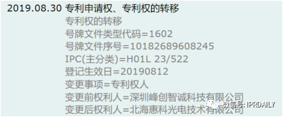 值得關(guān)注的是,經(jīng)查詢,此件專利于2019年8月進(jìn)行了專利權(quán)轉(zhuǎn)移,從原專權(quán)利權(quán)人“上海天馬微電子有限公司”,經(jīng)交易中介,轉(zhuǎn)移至“北海惠科光電技術(shù)有限公司”。