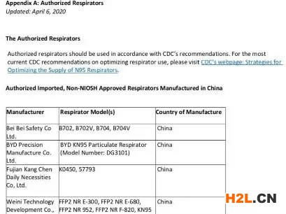 FDA網(wǎng)站上的一份文件顯示,F(xiàn)DA已為4家中國企業(yè)生產(chǎn)的部分型號口罩提供了EUA授權(quán)。這四家中國企業(yè)分別為比亞迪精密制造有限公司、Bei Bei Safety Co.,Ltd(總部位于中國臺灣)、福建康臣日用品有限公司以及威尼科技發(fā)展有限公司。