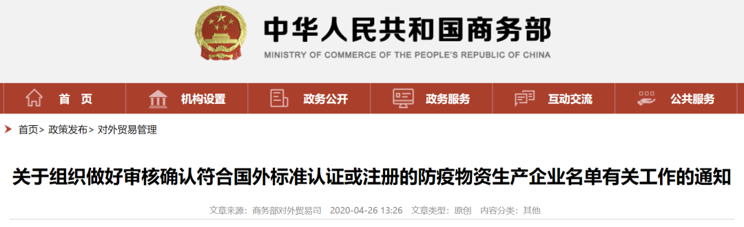 為做好《商務(wù)部 海關(guān)總署 國(guó)家市場(chǎng)監(jiān)督管理總局關(guān)于進(jìn)一步加強(qiáng)防疫物資出口質(zhì)量監(jiān)管的公告》(2020年第12號(hào))的落實(shí)工作,現(xiàn)就審核確認(rèn)符合國(guó)外標(biāo)準(zhǔn)認(rèn)證或注冊(cè)的防疫物資生產(chǎn)企業(yè)名單有關(guān)工作通知如下: