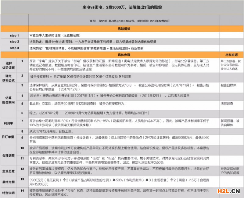 2018年12月28日,廣州知識產(chǎn)權(quán)法院判決,“街電”公司停止制造、使用侵害“來電”公司ZL01520103318.2“吸納式充電裝置”、ZL201520847953.1“移動電源租用設(shè)備及充電夾緊裝置”專利的產(chǎn)品;并賠償“來電”經(jīng)濟(jì)損失(含合理費用)每案1500萬元,兩案合計3000萬元。