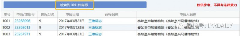 據(jù)商標(biāo)網(wǎng)查詢申請(qǐng)人“秦始皇帝陵博物院”,共檢索出1561件商標(biāo),發(fā)現(xiàn)其中“三維標(biāo)志”為絕大多數(shù)。于是筆者以“三維標(biāo)志”為商標(biāo)名稱、“秦始皇帝陵博物院”為申請(qǐng)人進(jìn)行了檢索: