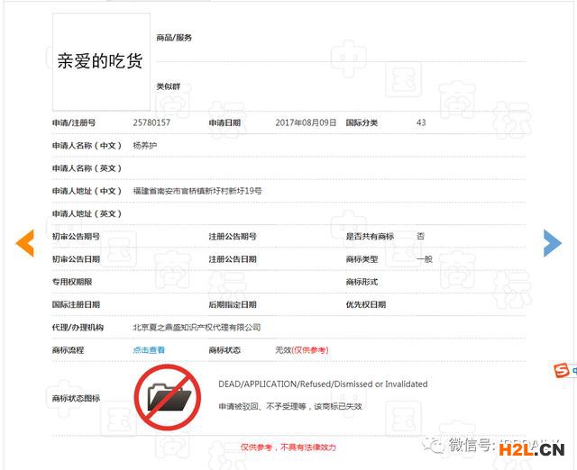 2017年8月9日,楊某申請了第25780157號“親愛的吃貨”商標(biāo),該商標(biāo)也被駁回,楊某不服商標(biāo)局的駁回決定,向商評委申請復(fù)審。