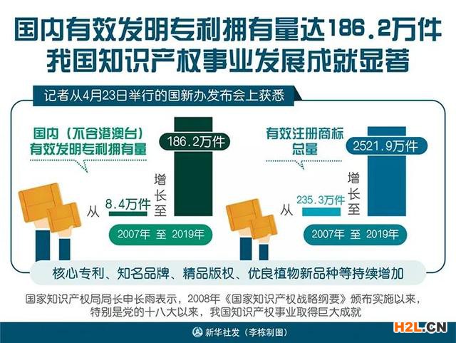 從知識產權擁有量看,我國已成為名副其實的知識產權大國。2007年至2019年,國內(不含港澳臺)有效發(fā)明專利擁有量從8.4萬件增長至186.2萬件,有效注冊商標總量從235.3萬件增長至2521.9萬件。著作權、植物新品種、地理標志、集成電路布圖設計等數量也大幅增長。核心專利、知名品牌、精品版權、優(yōu)良植物新品種等持續(xù)增加。