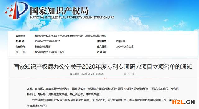 國家知識產權局辦公室關于2020年度專利專項研究項目立項名單的通知