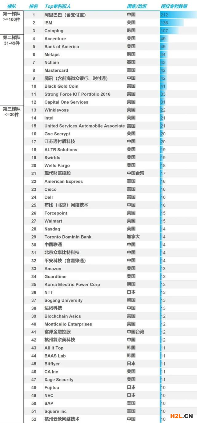 第一梯隊(duì)和第二梯隊(duì)的專利權(quán)人中,有2家中國(guó)企業(yè)——阿里巴巴(支付寶)和騰訊,2家韓國(guó)企業(yè)Coinplug和metaps,1家英國(guó)企業(yè)Nchain,其余均為美國(guó)企業(yè)。