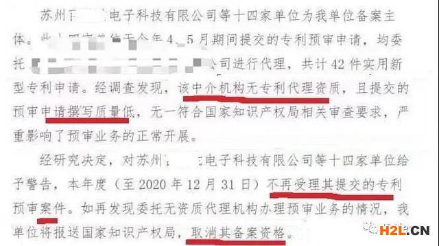 近日,蘇州某電子公司等十四家單位就因委托無專利代理資質(zhì)機構(gòu)提交專利預(yù)審申請被警告,且今年不再受理(十四家單位)提交的專利預(yù)審案件。如再發(fā)現(xiàn)委托無資質(zhì)代理機構(gòu)辦理預(yù)審業(yè)務(wù)的情況,將取消其備案資格。