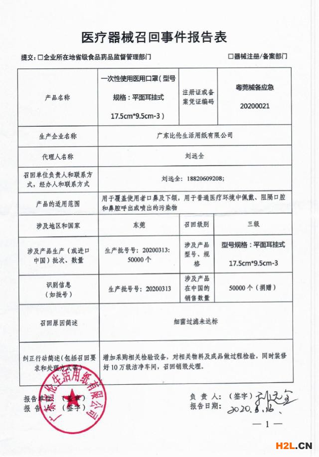 廣東比倫生活用紙有限公司報告,該公司對其生產(chǎn)的一次性使用醫(yī)用口罩實施主動召回處理,召回級別為三級,涉及產(chǎn)品的型號、規(guī)格及批次等詳細信息見《醫(yī)療器械召回事件報告表》。