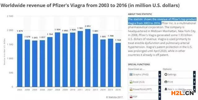 至于這件專利實(shí)際的價(jià)值,找了下專業(yè)的數(shù)據(jù)來源(The Statistics Portal)進(jìn)行核實(shí),輝瑞公司由銷售偉哥獲得的收入大約每年不會超過20億美元,滿打滿算20年,不會超過500億US刀。