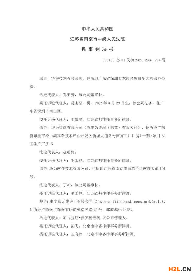 2019年9月16日,江蘇省南京市中級人民法院就合并審理的華為技術有限公司、華為終端有限公司、華為軟件技術有限公司起訴康文森無線許可公司確認不侵犯專利權及標準必要專利使用費糾紛三案作出一審,特此公開判決書全文。