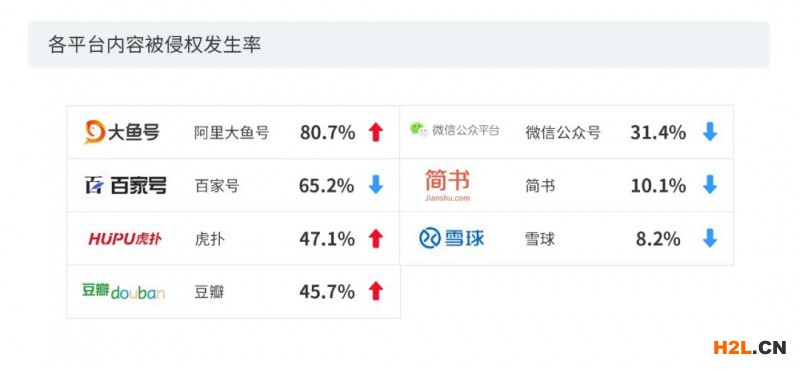 相反,雪球和簡書的被侵權發(fā)生率有所下降,分別下降了35.2%和13.6%,其中雪球是此次被侵權發(fā)生率降幅最大的平臺。