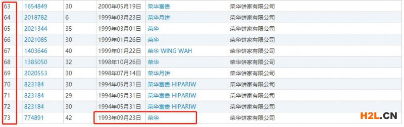 有關于榮華餅家的商標信息,筆者于商標網(wǎng)查詢“榮華”顯示,截至目前,榮華餅家有限公司申請了有關“榮華”的商標共73件。其實時間最早的在1993年9月23日就申請了,與其90年代進軍內地市場的信息基本相符。實際上,在2000年之前,榮華餅家共申請了十件相關商標。其中,第35類2021344號“榮華”商標、第30類2020553“榮華月餅”號商標均被駁回。