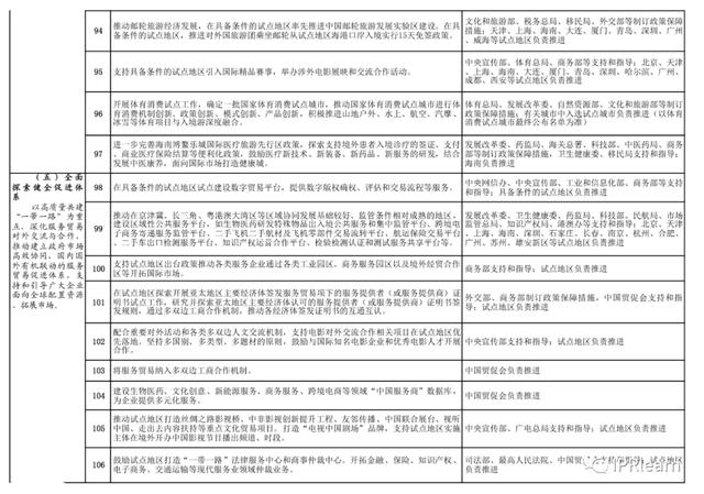 全面深化試點(diǎn)任務(wù)。本輪試點(diǎn),是在前兩輪基礎(chǔ)上的“全面深化”。重點(diǎn)圍繞推動(dòng)服務(wù)貿(mào)易改革、開(kāi)放、創(chuàng)新,提出三個(gè)方面8項(xiàng)試點(diǎn)任務(wù)、122項(xiàng)具體舉措。其中涉及知識(shí)產(chǎn)權(quán)如下: