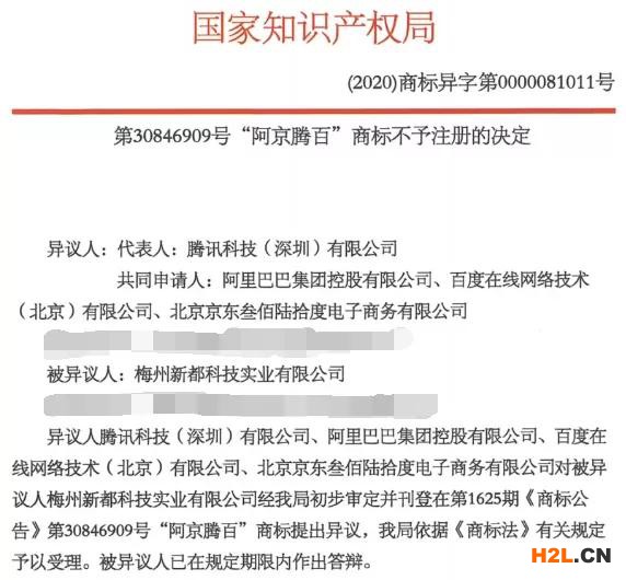 1、異議人(阿里、京東、騰訊和百度)為我國四家世界級互聯(lián)網(wǎng)知名企業(yè),“阿里”、“京東”、“騰訊”、“百度”是四個異議人的簡稱,也是異議人長期使用的商標(biāo),具有較高的知名度和影響力。