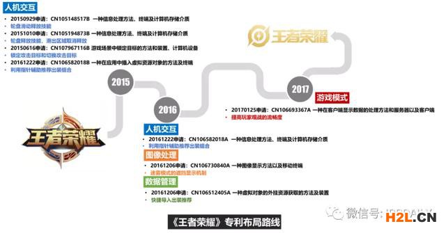 對(duì)騰訊的《王者榮耀》的專利布局路線進(jìn)行分析,可看出騰訊的游戲?qū)@季植呗缘淖兓?015年游戲上線之前,騰訊申請(qǐng)了較多涉及到游戲操作的人機(jī)交互類專利,及時(shí)對(duì)游戲的操作方法進(jìn)行保護(hù);而在2016年,隨著游戲的更新,騰訊的專利布局也在及時(shí)跟進(jìn),對(duì)于《王者榮耀》當(dāng)時(shí)上線的迷霧模式又申請(qǐng)了游戲圖像折疊和顯示機(jī)制的專利,對(duì)于快捷導(dǎo)入出裝推薦申請(qǐng)了人機(jī)交互和數(shù)據(jù)管理兩方面的專利,在2017年,隨著《王者榮耀》游戲直播的火爆,騰訊又對(duì)觀戰(zhàn)模式的優(yōu)化方案申請(qǐng)了專利。