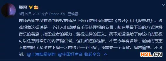 8月29日晚,搖滾歌手郭頂發(fā)文怒斥《中國(guó)好聲音》侵權(quán),表示在沒(méi)有取得自己任何授權(quán)的情況下,連續(xù)兩期使用了自己創(chuàng)作的兩首歌曲。一首是第一期學(xué)員潘虹演唱的《最好》,另一首是第二期學(xué)員太金之之演唱的《浪里游》。
