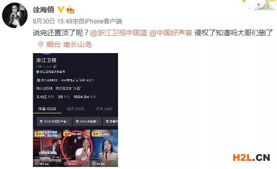 而后,徐海俏再次發(fā)微博質(zhì)問(wèn)《中國(guó)好聲音》,稱其不僅沒(méi)有把侵權(quán)歌曲《空》刪掉,反而還將該歌曲在宣傳平臺(tái)置頂了。