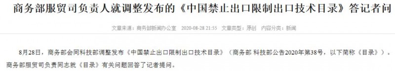 8月28日21:30分,商務(wù)部、科技部官網(wǎng)幾乎同時(shí)刊發(fā)關(guān)于調(diào)整發(fā)布《中國(guó)禁止出口限制出口技術(shù)目錄》的公告。