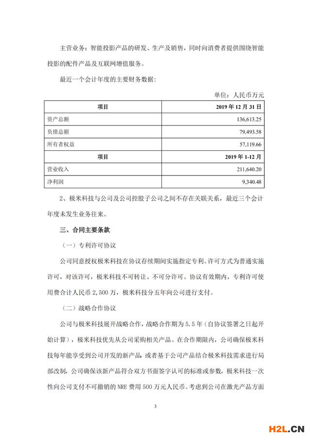 9月2日,光峰科技發(fā)布《深圳光峰科技股份有限公司關(guān)于公司與極米科技簽署專利許可協(xié)議暨戰(zhàn)略合作協(xié)議的公告》。公告稱,光峰科技已與成都極米科技股份有限公司(以下簡稱“極米科技”)簽署《戰(zhàn)略合作協(xié)議》,光峰科技同意授權(quán)極米科技在協(xié)議存續(xù)期間實(shí)施指定專利。協(xié)議有效期內(nèi),專利許可使用費(fèi)合計(jì)人民幣2,500萬,極米科技分五年向光峰科技進(jìn)行支付。光峰科技與極米科技展開戰(zhàn)略合作,戰(zhàn)略合作期為5.5年,在合作期限內(nèi),極米科技一次性向光峰科技支付不可撤銷的NRE費(fèi)用500萬元人民幣。考慮到光峰科技在激光產(chǎn)品方面的技術(shù)積累和先發(fā)優(yōu)勢,極米科技承諾自協(xié)議簽署之日起在戰(zhàn)略合作期內(nèi)每年優(yōu)先向光峰科技采購一定金額的激光超短焦光機(jī)組件產(chǎn)品。
