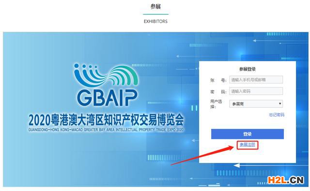 點(diǎn)擊頂部“登錄”位置,然后依次點(diǎn)擊“參展注冊(cè)”和勾選“我已閱讀并接受 《粵港澳大灣區(qū)知識(shí)產(chǎn)權(quán)交易博覽會(huì)用戶協(xié)議》”選框,進(jìn)入?yún)⒄股套?cè)頁(yè)面。