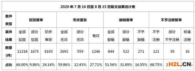 2020年7月16日至8月15日,審理簽發(fā)各類評(píng)審案件23308件,同比減少24.66%,其中簽發(fā)駁回復(fù)審案件16996件,同比減少38.00%,簽發(fā)復(fù)雜案件6312件 ,同比增長(zhǎng)79.06%,按換算工作量計(jì)算,同比增長(zhǎng)21.36%。