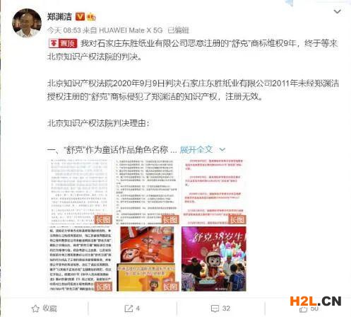 2020年9月15日,鄭淵潔發(fā)布微博稱,自己對石家莊東勝紙業(yè)有限公司惡意注冊的“舒克”商標(biāo)維權(quán)9年,如今終于等來北京知識產(chǎn)權(quán)法院的判決,法院判決石家莊東勝紙業(yè)有限公司敗訴。