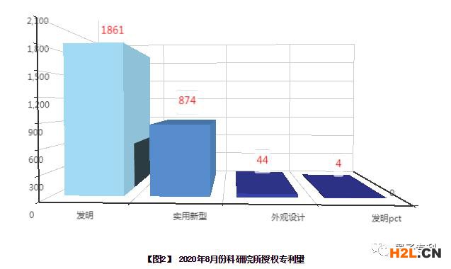 2020年8月份科研院所授權(quán)專利 2783 件,如【圖2】所示,其中發(fā)明 1861 件、實(shí)用新型 874 件、外觀設(shè)計(jì) 44 件,PCT專利 4 件,發(fā)明專利占比 66.87% 。