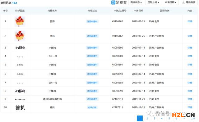 據(jù)企查查顯示,德州扒雞公司共申請(qǐng)了162個(gè)商標(biāo)。