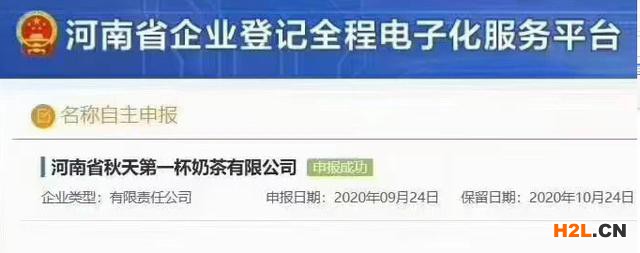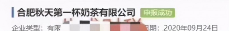 另外有消息稱,河南省秋天第一杯奶茶有限公司已于2020年9月24日申報成功,名稱保留一個月至10月24日。安徽省秋天第一杯奶茶有限公司、合肥秋天第一杯奶茶有限公司、秋天第壹杯奶茶有限公司等名稱也已相繼被占用。