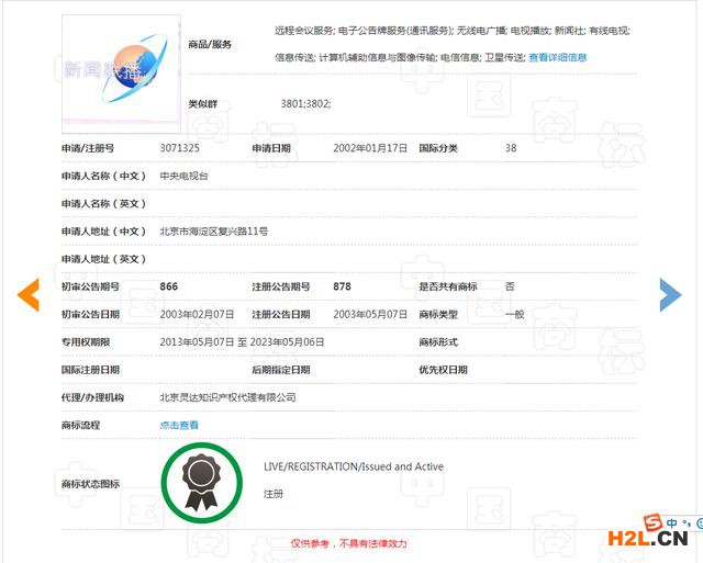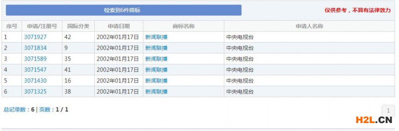 據(jù)商標局網(wǎng)站查詢得知,中央電視臺于2002年1月17日申請注冊了6件“新聞聯(lián)播”圖文商標,涉及6個類別。