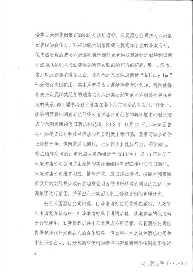 本案被告經營的都江堰中心假日酒店,其前身為六洲酒店集團授權的都江堰中心智選假日酒店。2018年6月12日,六洲酒店集團向涉案酒店的前經營方都江堰鈴蘭酒店管理有限公司發(fā)出函件,聲明雙方合同將于2018年7月12日終止,并要求對方停止使用一切六洲酒店集團享有權利的商標或標識。隨后,涉案酒店更名為都江堰中心假日酒店,并將管理公司變更為都江堰云裳酒店管理有限公司。2018年10月12日,六洲酒店集團向本案被告發(fā)出律師函,要求被告停止侵權,但被告尋找各種理由不予配合。針對六洲酒店集團的工商投訴,工商認定不構成相同商標,也不會造成消費者混淆,遂不侵權。2019年3月7日,六洲酒店集團無奈向成都市中級人民法院知識產權法庭提起商標侵權訴訟,索賠人民幣300萬元,并同時申請了300萬元的財產保全。