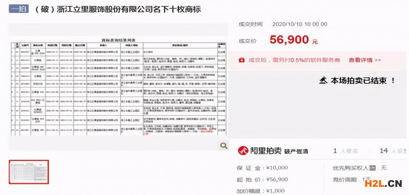 此次網(wǎng)拍的浙江立里服飾股份有限公司10枚商標(biāo)僅一人參拍,最終臨近網(wǎng)拍結(jié)束時(shí)出價(jià),以起拍價(jià)5.69萬元成交。