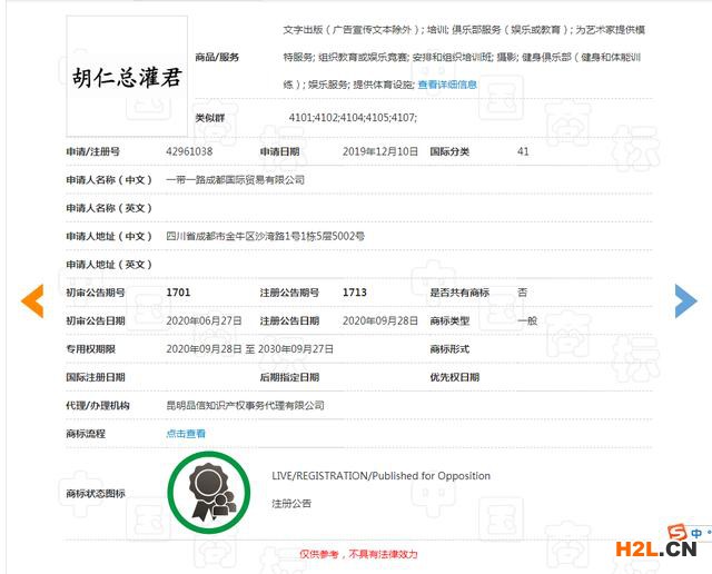 商標(biāo)局網(wǎng)站查詢得知,“湖人總冠軍”的諧音“胡仁總灌君”已于2019年12月10日被一帶一路成都國(guó)際貿(mào)易有限公司申請(qǐng)為商標(biāo)。