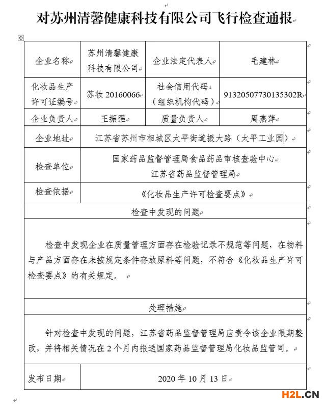 對(duì)蘇州清馨健康科技有限公司飛行檢查通報(bào)