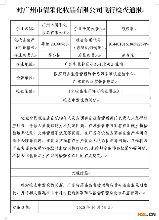 對(duì)廣州市倩采化妝品有限公司飛行檢查通報(bào)