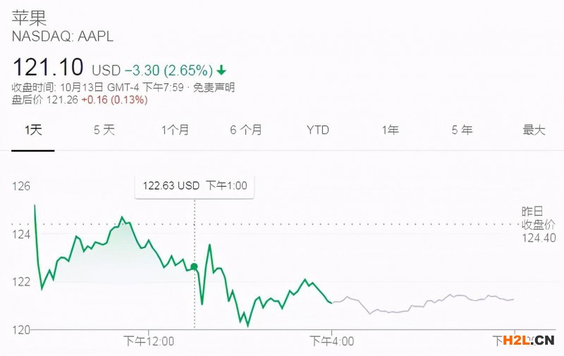 美股開盤早于蘋果發(fā)布會(huì),之前市場(chǎng)還只是震蕩調(diào)整,當(dāng)發(fā)布會(huì)進(jìn)行到庫克上臺(tái)講解iPhone時(shí),蘋果股價(jià)進(jìn)入深V拐點(diǎn),盤中跌幅一度達(dá)到3.6%。截至收盤,蘋果股價(jià)下跌2.65%,報(bào)121.1美元。