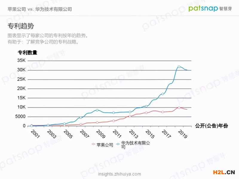 從專利趨勢(shì)的維度也可以看出,蘋果專利公開(公告)數(shù)量的年增長(zhǎng)是一條比較平緩的上升曲線,而華為的專利總量自2003年超過蘋果后,從2013年開始,其增長(zhǎng)曲線被陡然拉直,后來居上不說,還逐漸甩開了與蘋果的差距。