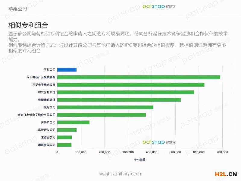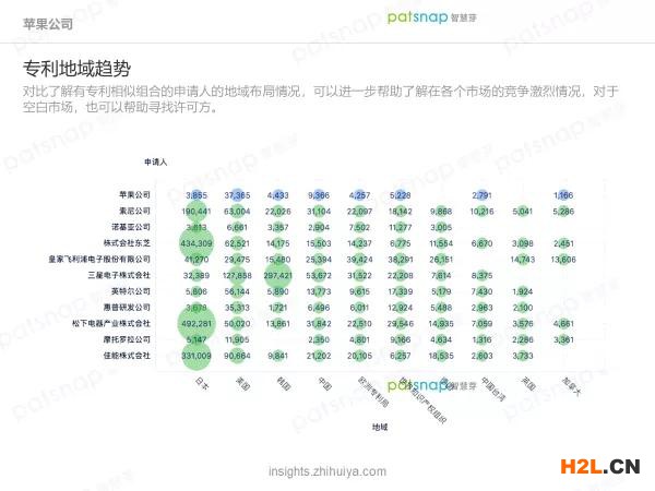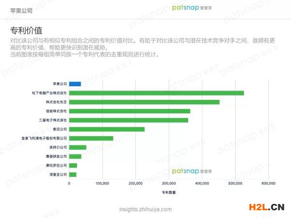 其二是,從蘋果與競(jìng)爭(zhēng)公司的相似專利組合、專利價(jià)值、專利年趨勢(shì)、專利地域趨勢(shì)等多個(gè)維度進(jìn)行對(duì)比,除了華為之外,韓國(guó)的三星、日本的松下、東芝、佳能、索尼等公司的表現(xiàn)均優(yōu)于蘋果。