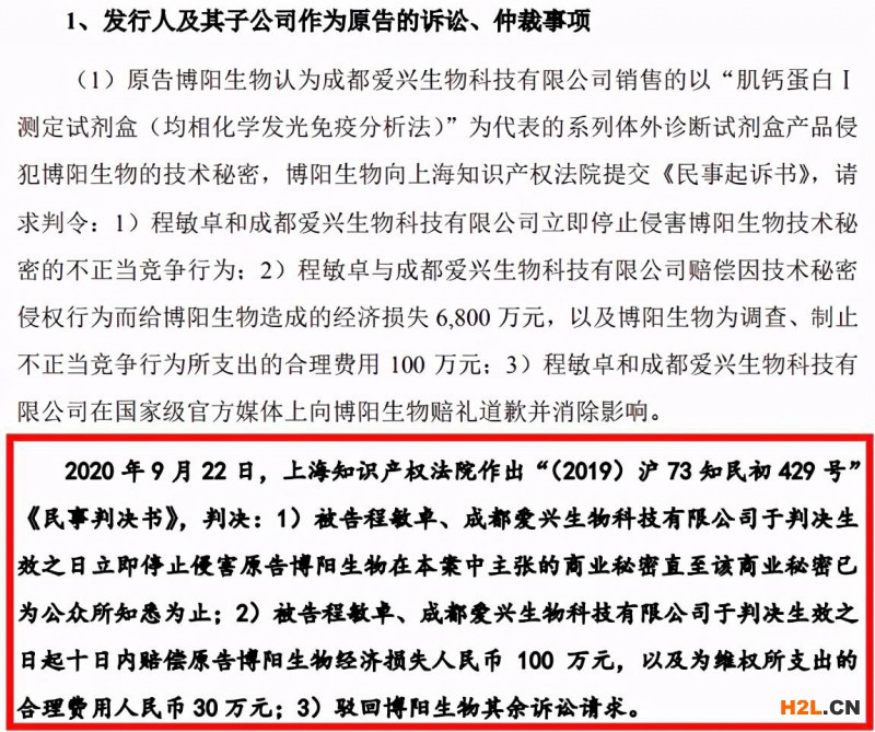 根據(jù)10月15日科美診斷IPO審核階段更新的最新信息顯示,上海知識(shí)產(chǎn)權(quán)法院在9月22日作出本案的《民事判決書(shū)》,判決:(1)程敏卓、愛(ài)興生物停止侵害博陽(yáng)生物(注:已被科美診斷收購(gòu))的技術(shù)秘密;(2)賠償經(jīng)濟(jì)損失100萬(wàn)元,及合理維權(quán)支出30萬(wàn)元;(3)駁回其余訴訟請(qǐng)求。