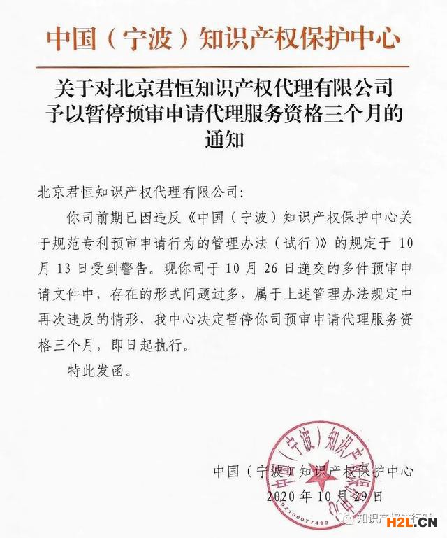 北京君恒知識(shí)產(chǎn)權(quán)代理有限公司前期已因違反《中國(guó)(寧波)知識(shí)產(chǎn)權(quán)保護(hù)中心關(guān)于規(guī)范專利預(yù)審申請(qǐng)行為的管理辦法(試行)》的規(guī)定于10月13日受到警告(處罰文件)。該公司于10月26日遞交的多件預(yù)審申請(qǐng)文件中,存在的形式問(wèn)題過(guò)多,屬于上述管理辦法規(guī)定中再次違反的情形,我中心決定暫停北京君恒知識(shí)產(chǎn)權(quán)代理有限公司預(yù)審申請(qǐng)代理服務(wù)資格三個(gè)月,即日起執(zhí)行。