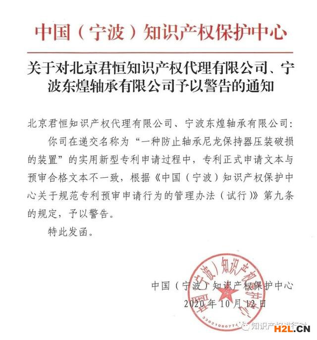 近期,北京君恒知識(shí)產(chǎn)權(quán)代理有限公司、寧波東煌軸承有限公司在預(yù)審合格后國(guó)家知識(shí)產(chǎn)權(quán)局遞交專利申請(qǐng)的過(guò)程中,未按要求提交預(yù)審合格后的申請(qǐng)文件,根據(jù)《中國(guó)(寧波)知識(shí)產(chǎn)權(quán)保護(hù)中心關(guān)于規(guī)范專利預(yù)審申請(qǐng)行為的管理辦法(試行)》第九條的規(guī)定,我中心現(xiàn)予以警告處分。若再次違反,將暫停其預(yù)審服務(wù)請(qǐng)求資格或預(yù)審案件代理服務(wù)資格三到六個(gè)月;累計(jì)違反三次及以上或情節(jié)特別嚴(yán)重的,將停止其預(yù)審服務(wù)請(qǐng)求資格或預(yù)審案件代理服務(wù)資格一年到三年。