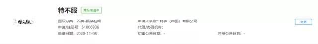另據(jù)天眼查,特步(中國)有限公司新增商標(biāo)申請信息,商標(biāo)名稱為“特不服”,商標(biāo)分類涵蓋服裝鞋帽、皮革皮具等,商標(biāo)狀態(tài)為商標(biāo)申請中。