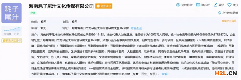 企查查App顯示,11月23日,海南耗子尾汁文化傳媒有限公司成立,該公司法定代表人和大股東均為陳澡龍,持股100%,監(jiān)視人為楊子英,注冊資本為100萬人民幣,在海南省市場監(jiān)督管理局登記。經(jīng)營范圍包括許可項目互聯(lián)網(wǎng)直播服務(wù)、互聯(lián)網(wǎng)域名注冊服務(wù)、互聯(lián)網(wǎng)信息服務(wù)、互聯(lián)網(wǎng)新聞信息服務(wù)等。