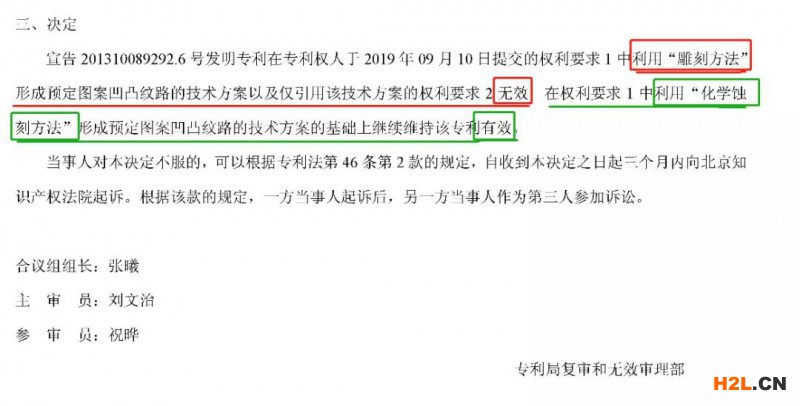據(jù)無效宣告請求審查決定書顯示:宣告201310089292.6號發(fā)明專利在專利權(quán)人于2019年09月10日提交的權(quán)利要求1中利用“雕刻方法”形成預(yù)定圖案凹凸紋路的技術(shù)方案以及僅引用該技術(shù)方案的權(quán)利要求2無效;權(quán)利要求1中利用“化學(xué)蝕刻方法”形成預(yù)定圖案凹凸紋路的技術(shù)方案人基礎(chǔ)上繼續(xù)維持該專利權(quán)有效。