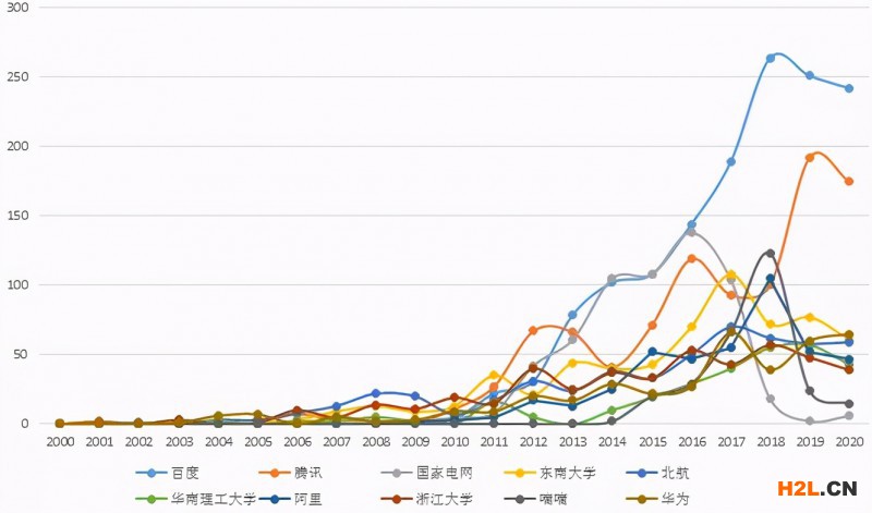 我國(guó)企業(yè)中,百度公司發(fā)力最早,其從2004年開(kāi)始在交通大數(shù)據(jù)領(lǐng)域內(nèi)進(jìn)行技術(shù)布局,2012年更是加快技術(shù)創(chuàng)新步伐,截止2020年10月底,百度分別以1237件申請(qǐng)量和384件授權(quán)量排名專(zhuān)利創(chuàng)新榜第一。滴滴公司作為后起網(wǎng)約車(chē)平臺(tái)公司,其于2014年開(kāi)始發(fā)力,到2018年申請(qǐng)量也到達(dá)高峰。總體來(lái)看,交通大數(shù)據(jù)領(lǐng)域技術(shù)主體大都是從2011年開(kāi)始進(jìn)行專(zhuān)利布局,除國(guó)家電網(wǎng)公司的技術(shù)布局主要集中在2011-2018年之外,剩余權(quán)利主體技術(shù)創(chuàng)新活躍期都是自2015年以后,尤其是近幾年交通大數(shù)據(jù)技術(shù)的創(chuàng)新和應(yīng)用得到廣泛關(guān)注。