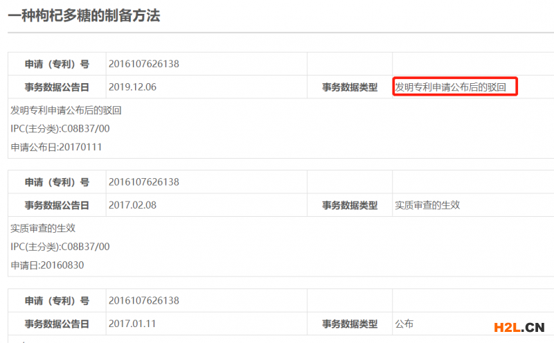 記者按專利申請?zhí)柎a,通過國家知識產(chǎn)權(quán)局專利查詢系統(tǒng)查詢到,其中“一種枸杞多糖的制備方法(專利申請?zhí)?01610762613.8)“的專利申請,顯示為被駁回的狀態(tài)。
