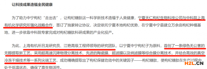 據(jù)寧夏天仁官網(wǎng)介紹,該公司于2016年投資1.5億元,獨(dú)家轉(zhuǎn)化中科院上海有機(jī)所技術(shù),買斷枸杞糖肽成果研發(fā)專利。