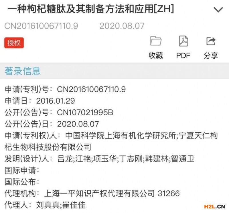 在“Innojoy專利寶”上以“枸杞糖肽”作為關(guān)鍵字搜索,目前被授權(quán)的專利,只有一項(xiàng)——“一種枸杞糖肽及其制備方法和應(yīng)用”已獲授權(quán),專利號ZL201610067110.9,發(fā)明人為呂龍、江艷等,專利權(quán)人為“中科院上海有機(jī)所”以及寧夏天仁枸杞生物科技股份有限公司(下稱“寧夏天仁”)。這項(xiàng)專利于2016年1月29日申請,目前已獲授權(quán)。