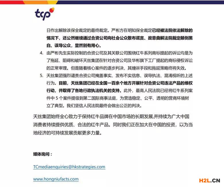 11月21日,北京紅牛再發(fā)聲明,否認(rèn)天絲集團(tuán)所指的聲明不實,并表示將向泰國天絲及相關(guān)人士提起侵犯名譽(yù)權(quán)訴訟。