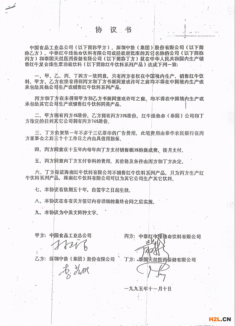 有意思的是,對比發(fā)現(xiàn),這份協(xié)議書的丙方和合資合同里的丙方并不一致,這份協(xié)議沒有經(jīng)過合資公司發(fā)起人——大股東紅牛維他命飲料(泰國)有限公司的批準(zhǔn),簽署協(xié)議的幾方也并非如今合資公司的股東。